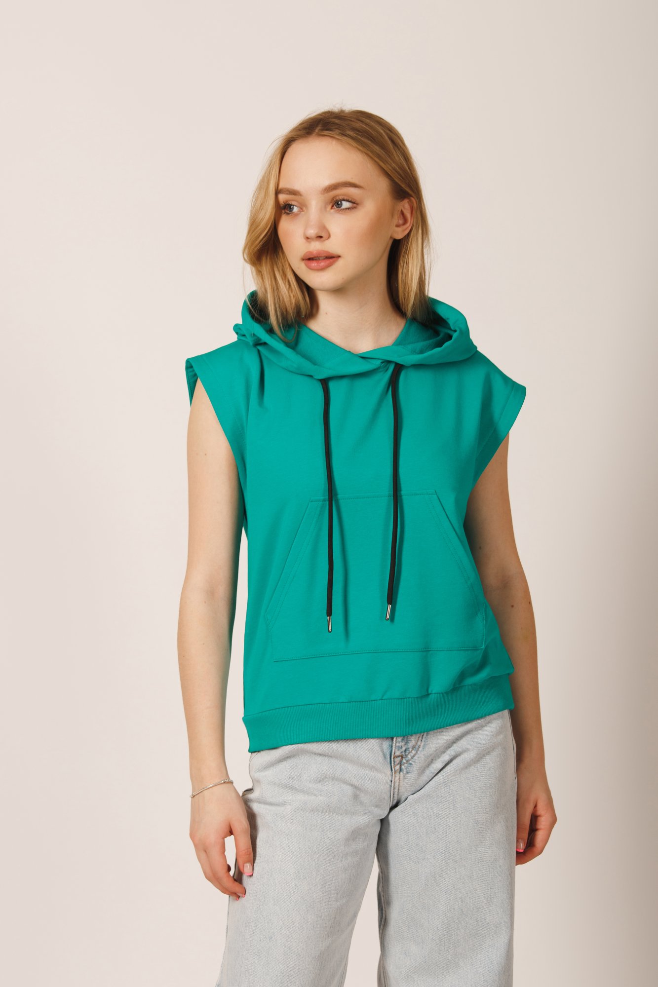 Стильный топ–худи без рукавов, выполнен из премиального турецкого футера 2-ух нитки. Наша трендовая модель, которая точно должна быть в гардеробе каждой девушки. Худи с несъёмным капюшоном, объём которого регулируется шнуром. На полочке изделия вместительный карман кенгуру. Проймы худи декорированы ластовицей из рибаны (кашкорсе). Отличный вариант на каждый день, в офис, на прогулку, на отдых. Гладить с изнанки. Стирка при t не более 30С. Деликатный отжим, отбеливание запрещено.