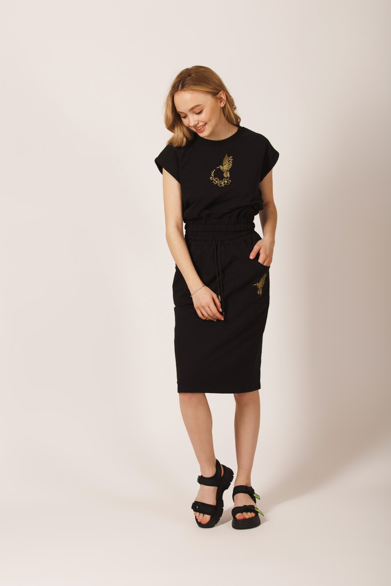 Изысканный женственный костюм, выполнен из премиального турецкого футера 2-ух нитки Paris Slub. В комплекте топ и юбка. Это модель, которая должна быть в гардеробе каждой девушки. Топ с рукавом реглан и оригинальной вышивкой золотой нитью на полочке. Юбка идеально сидит по фигуре, не сковывает движения. На поясе изделия шнур с наконечниками для регулирования объёма. По бокам юбки вместительные накладные карманы, один из которого декорирован вышивкой золотой нитью. Отличный вариант на каждый день, в офис, на прогулку, на отдых. Гладить с изнанки. Стирка при t не более 30С. Деликатный отжим, отбеливание запрещено.