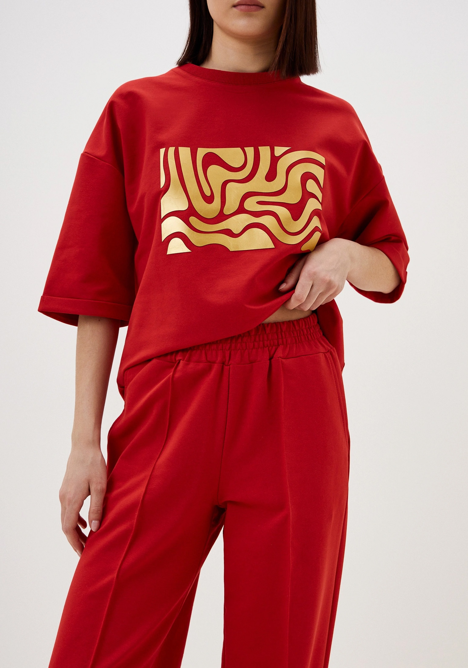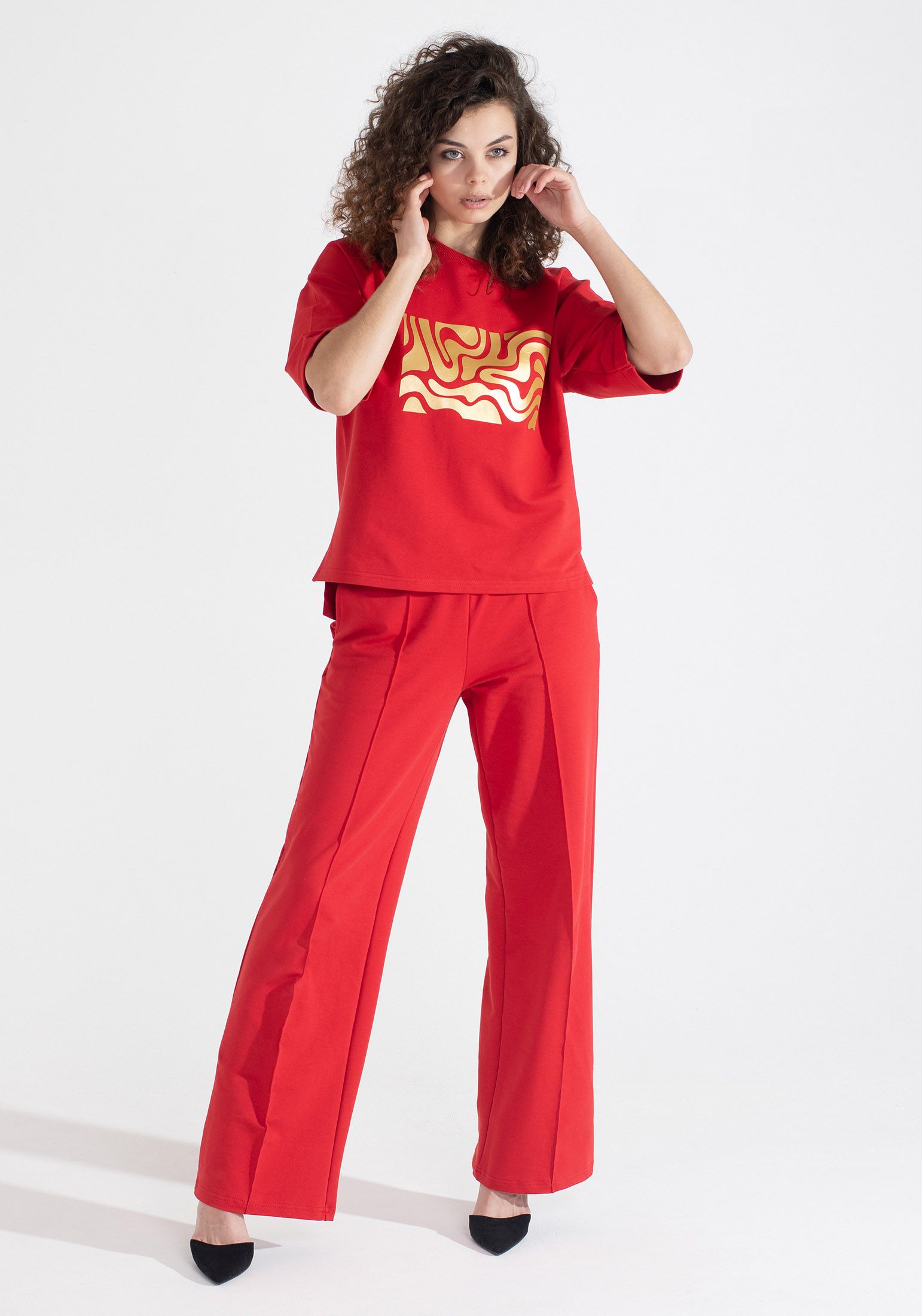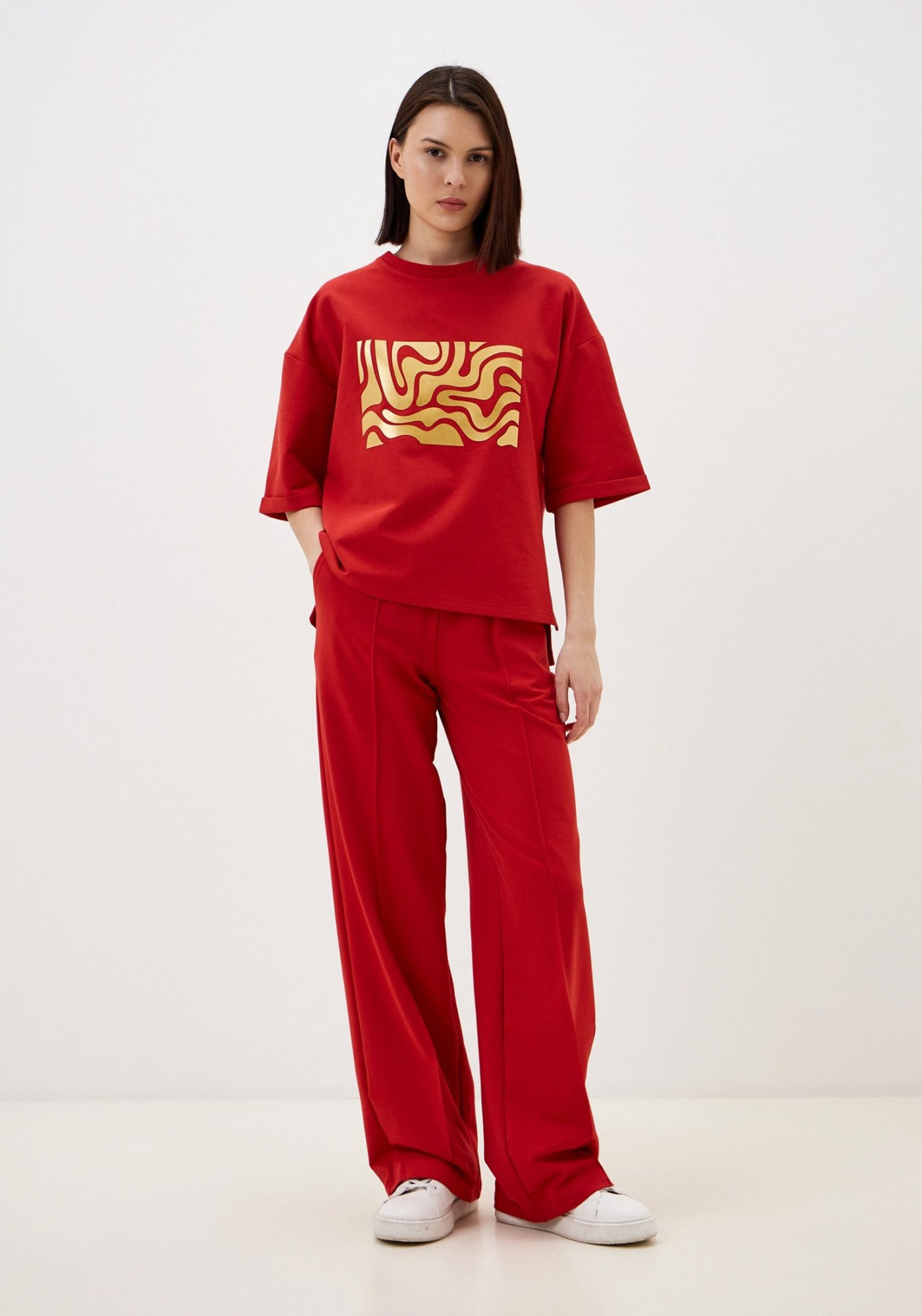 Стильный женский костюм, состоящий из брюк палаццо со стрелками (защипами) и джемпера с коротким рукавом, выполненный из высококачественного турецкого футера 2-х нитки. Оригинальный джемпер с коротким рукавом и круглым вырезом воротника. Элегантный образ создаётся за счёт разной длины спинки и полочки и разрезов в боковых швах. На полочке изделия шикарный принт с эффектом кожи. На рукавах отвороты, благодаря которым видно красивую фактуру футера. Стрелки защипы на брюках - это стильная и элегантная деталь, которая придает особый шик вашему образу. Трикотажные женские брюки свободного силуэта. На поясе удобная и широкая резинка, два вместительных боковых кармана. Наша одежда свободного кроя - идеальное решение на каждый день. Такой крой даёт ощущение комфорта, свободы и раскованности. Наша актуальная модель будет прекрасным подарком на новый год, к 8 марта, день святого Валентина, на день рождение, на день матери. Сделано в России с любовью к Вам! Гладить с изнанки. Стирка при t не более 30С. Деликатный отжим, отбеливание запрещено. При соблюдении наших несложных правил ухода одежда DS будет радовать Вас долгое время!