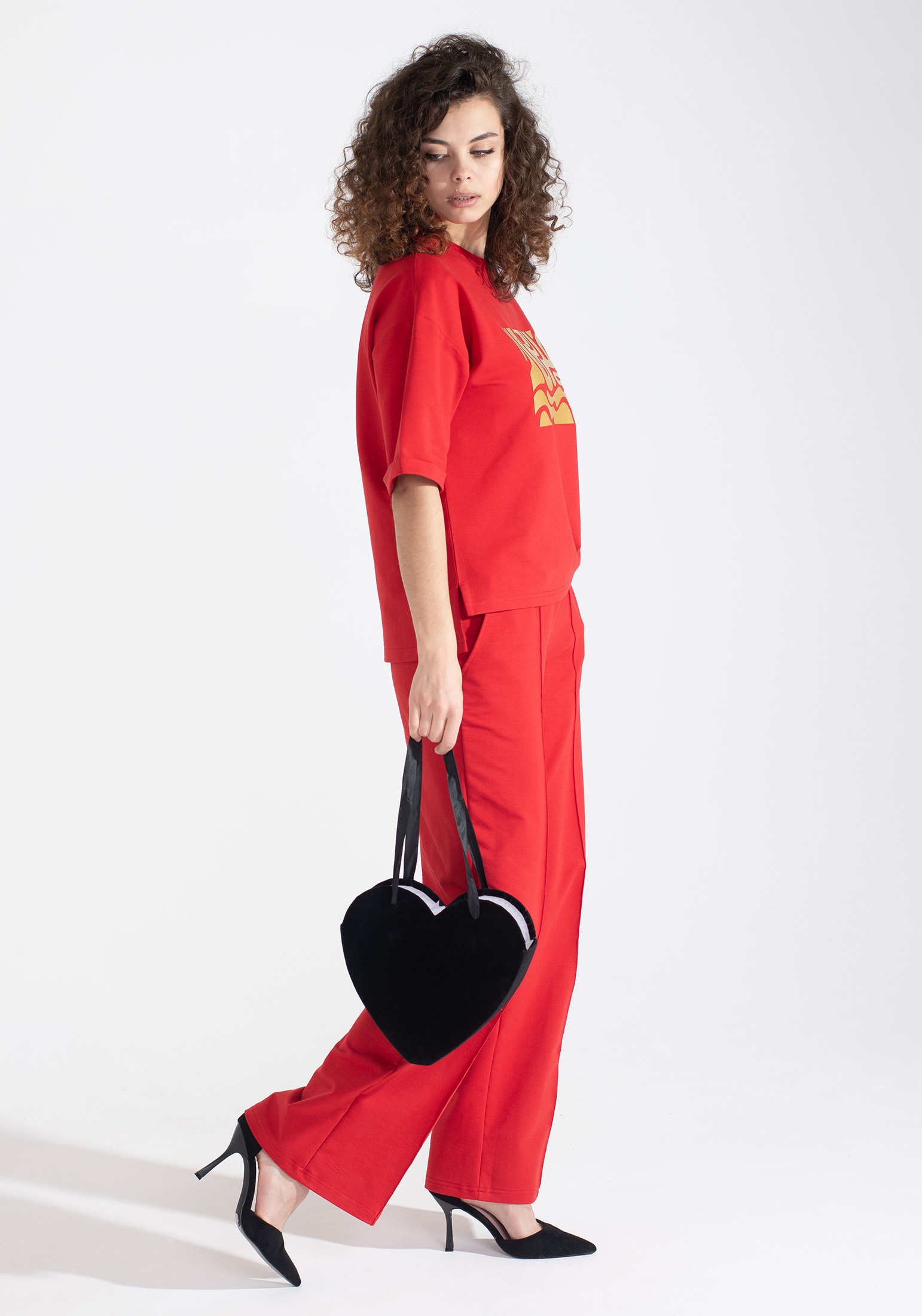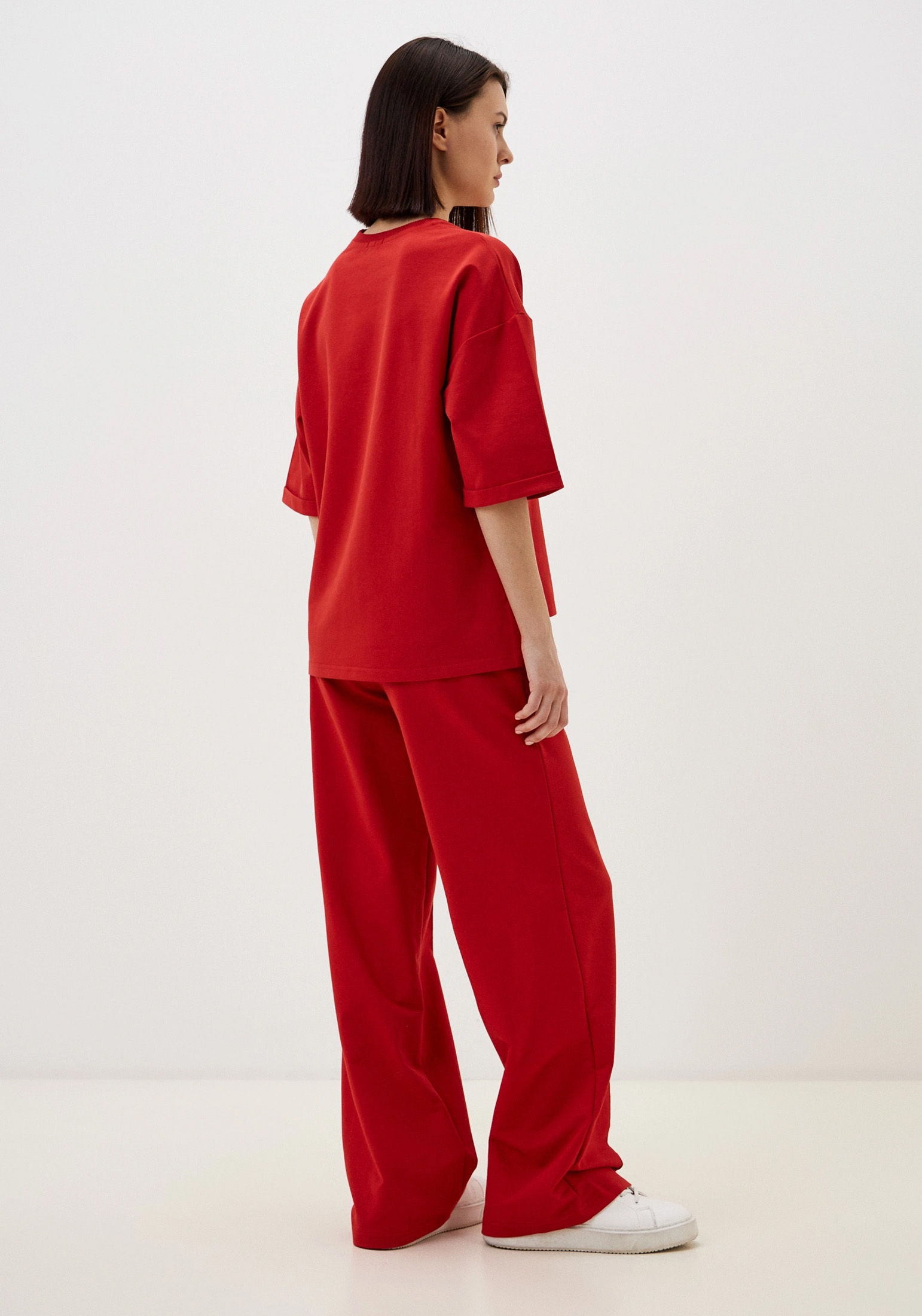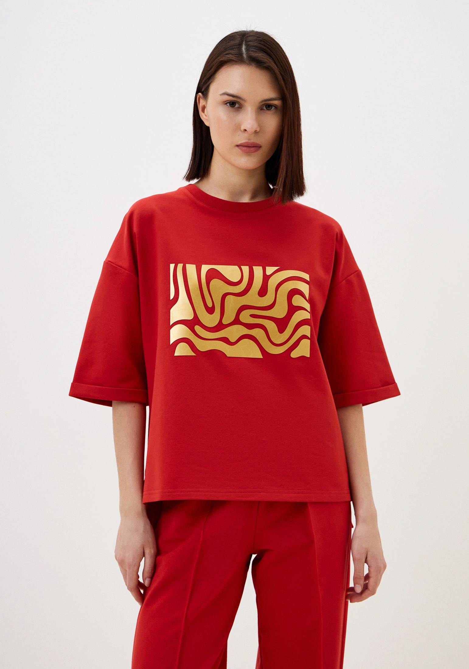 Стильный женский костюм, состоящий из брюк палаццо со стрелками (защипами) и джемпера с коротким рукавом, выполненный из высококачественного турецкого футера 2-х нитки. Оригинальный джемпер с коротким рукавом и круглым вырезом воротника. Элегантный образ создаётся за счёт разной длины спинки и полочки и разрезов в боковых швах. На полочке изделия шикарный принт с эффектом кожи. На рукавах отвороты, благодаря которым видно красивую фактуру футера. Стрелки защипы на брюках - это стильная и элегантная деталь, которая придает особый шик вашему образу. Трикотажные женские брюки свободного силуэта. На поясе удобная и широкая резинка, два вместительных боковых кармана. Наша одежда свободного кроя - идеальное решение на каждый день. Такой крой даёт ощущение комфорта, свободы и раскованности. Наша актуальная модель будет прекрасным подарком на новый год, к 8 марта, день святого Валентина, на день рождение, на день матери. Сделано в России с любовью к Вам! Гладить с изнанки. Стирка при t не более 30С. Деликатный отжим, отбеливание запрещено. При соблюдении наших несложных правил ухода одежда DS будет радовать Вас долгое время!
